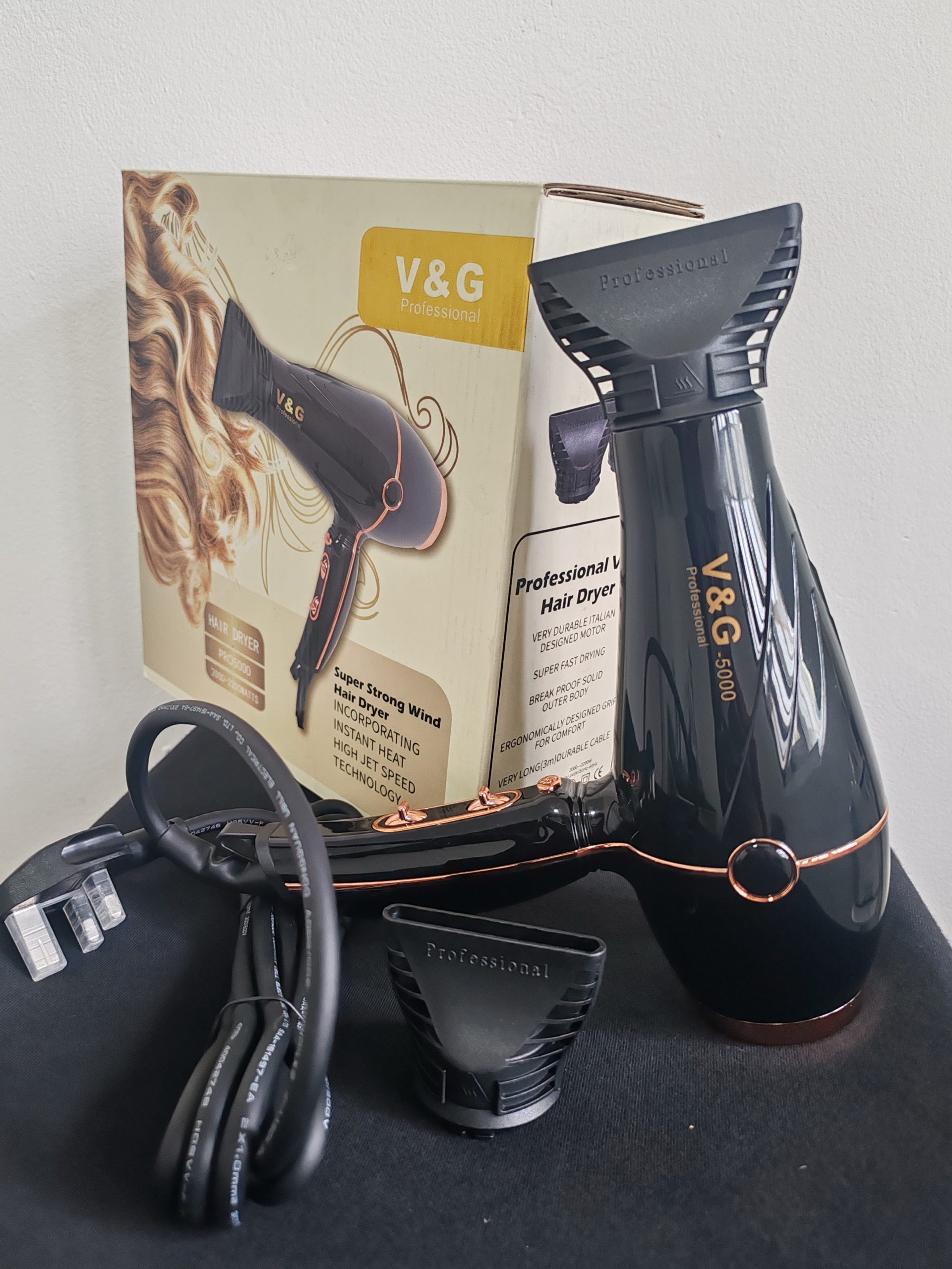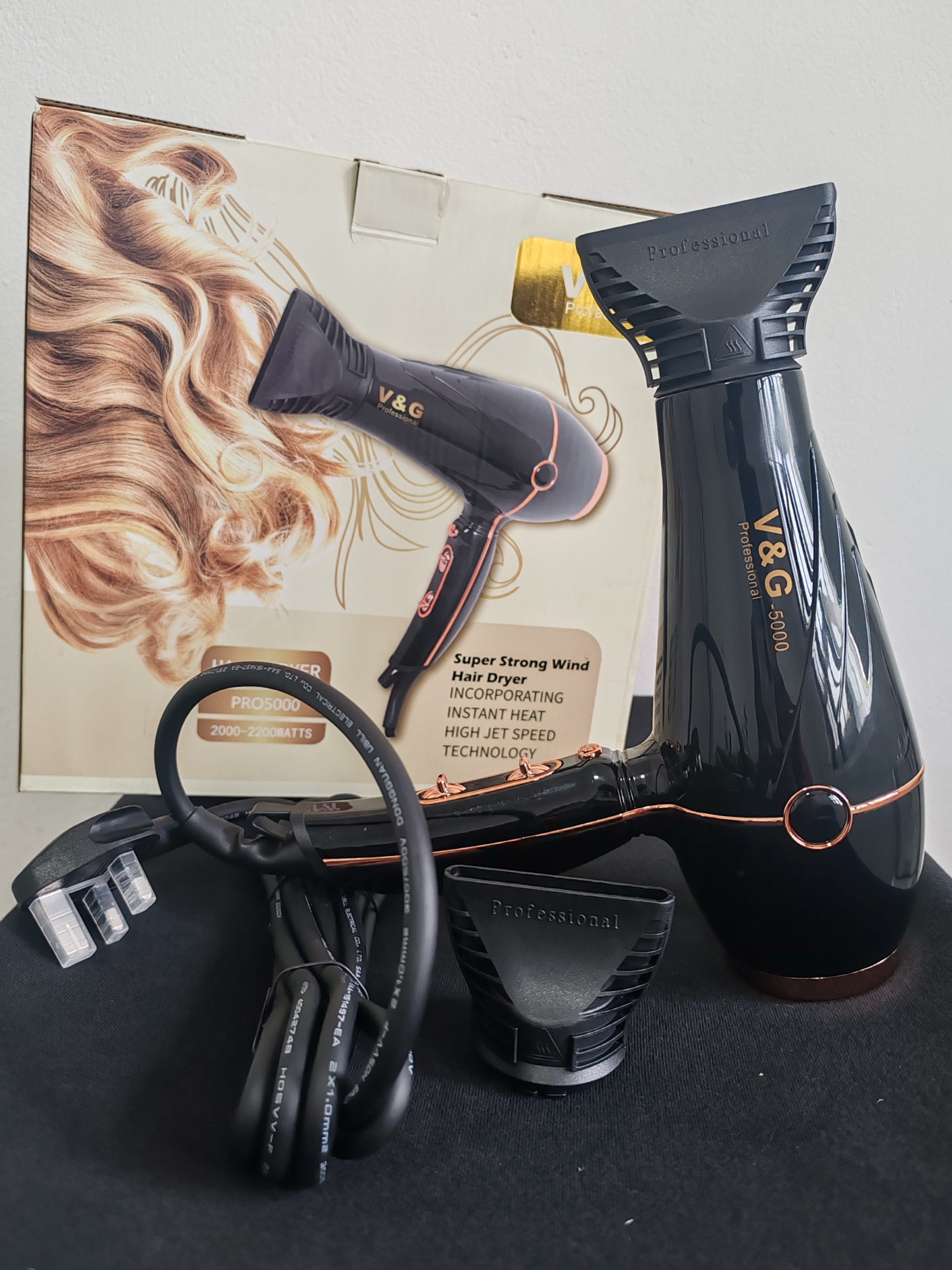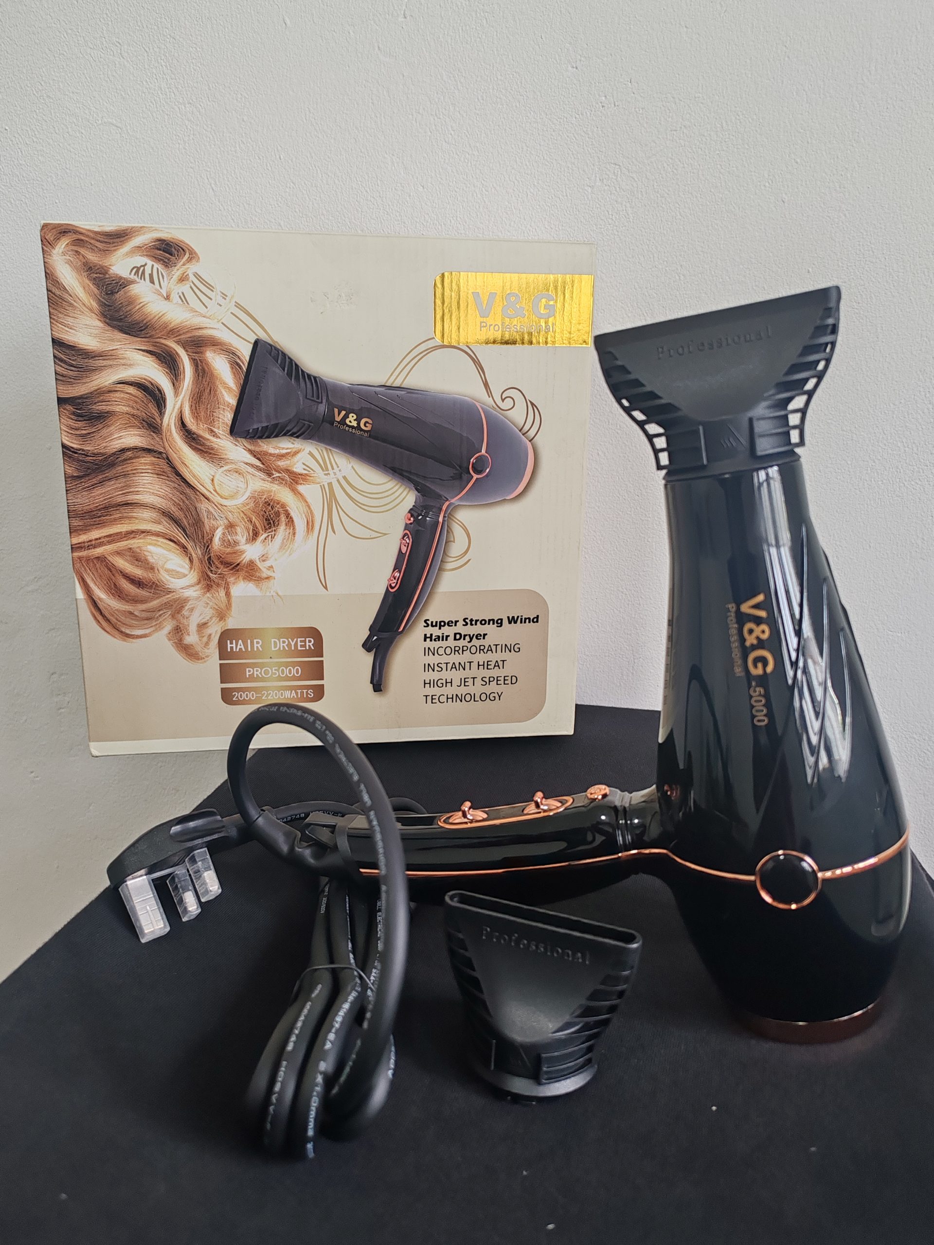 This is a V&G Pro5000 professional hair dryer, a powerful styling tool featuring 2000-2200 watts of power for fast drying.Ā